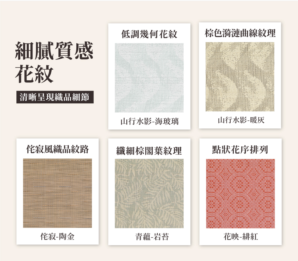 山行水影-海玻璃, 山行水影-暖灰, 侘寂-陶金, 花映-緋紅, 青蘊-岩苔