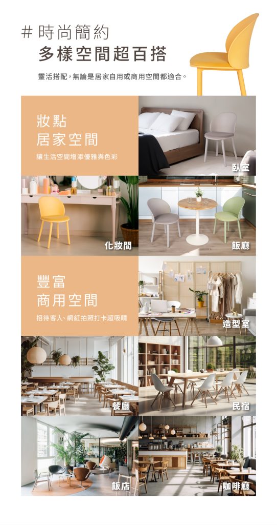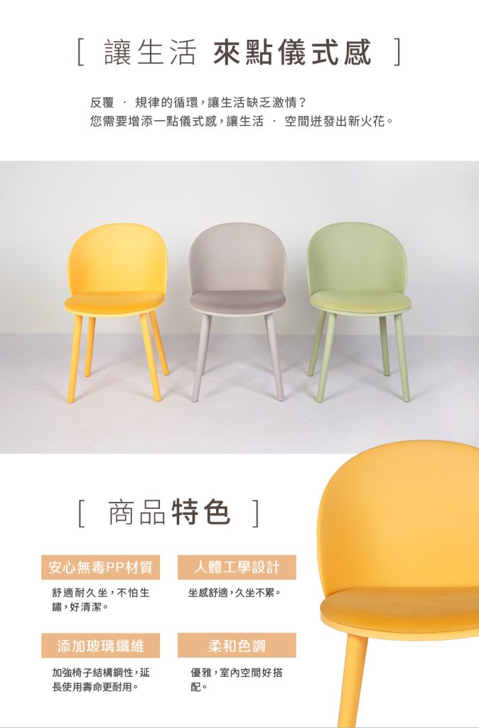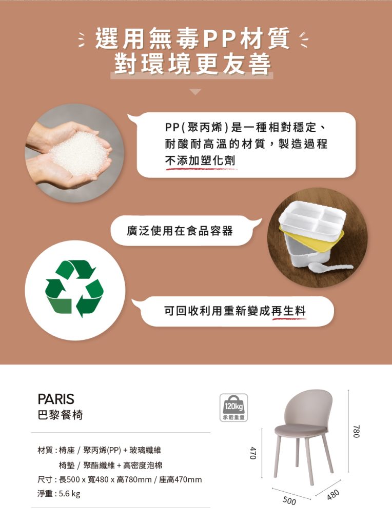 6.椅面及椅腳為聚丙烯(PP)材質,添加玻璃纖維強化椅子鋼性,增加承重力更堅固耐用。