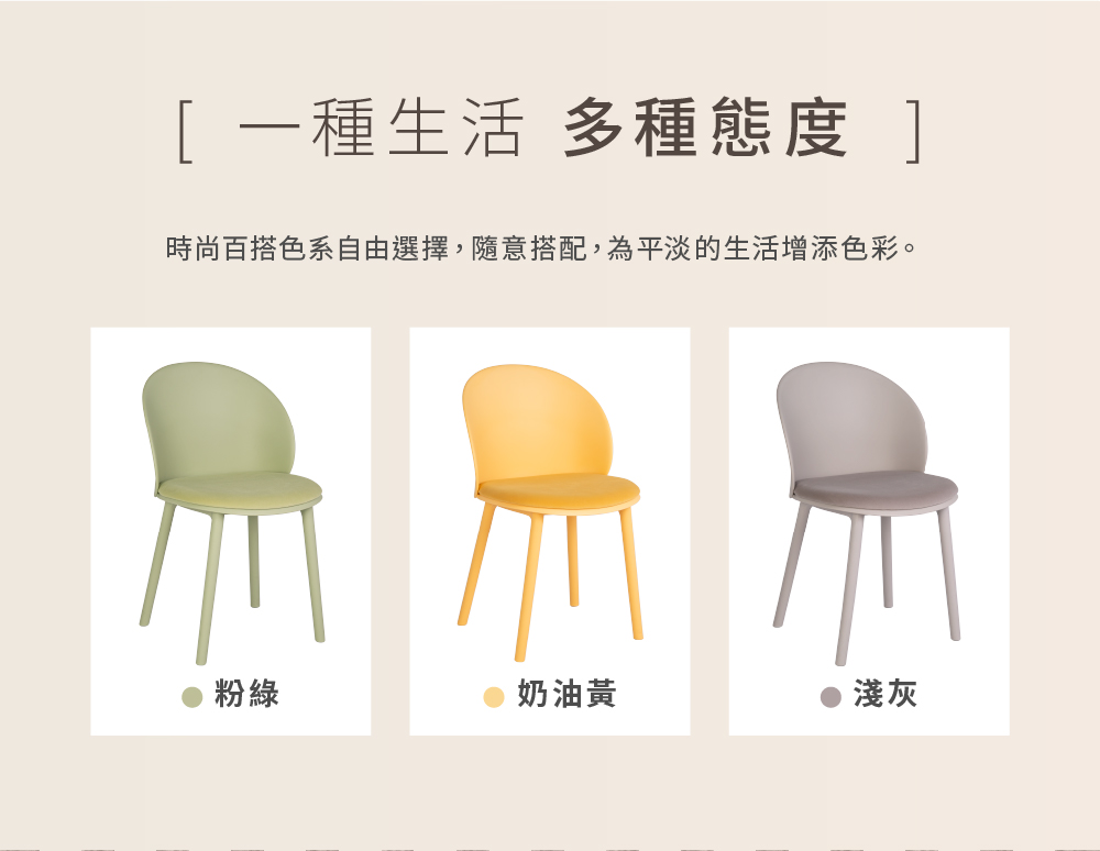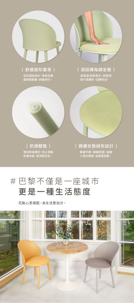 巴黎餐椅浪漫風格造型,就是表現出對生活的追求,柔和不搶戲的色調與外觀,搭配親膚手感的絨布坐墊設計,不但更能融入室內環境,坐起來也更舒適。