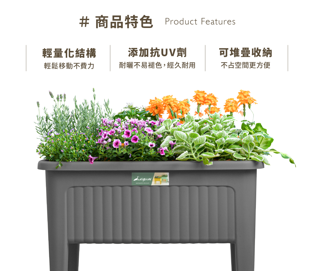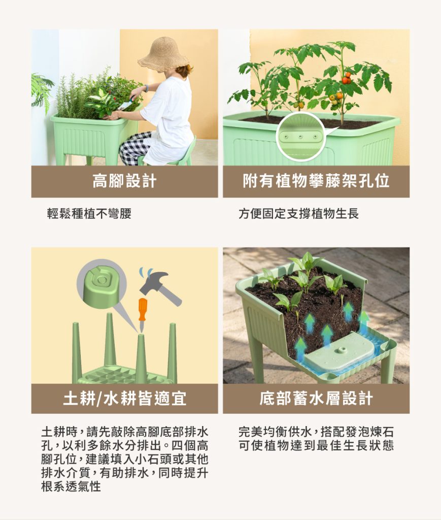 1.高腳設計,免彎腰即可種植,播種、澆水與日常整理更輕鬆,長時間園藝也不易疲勞。